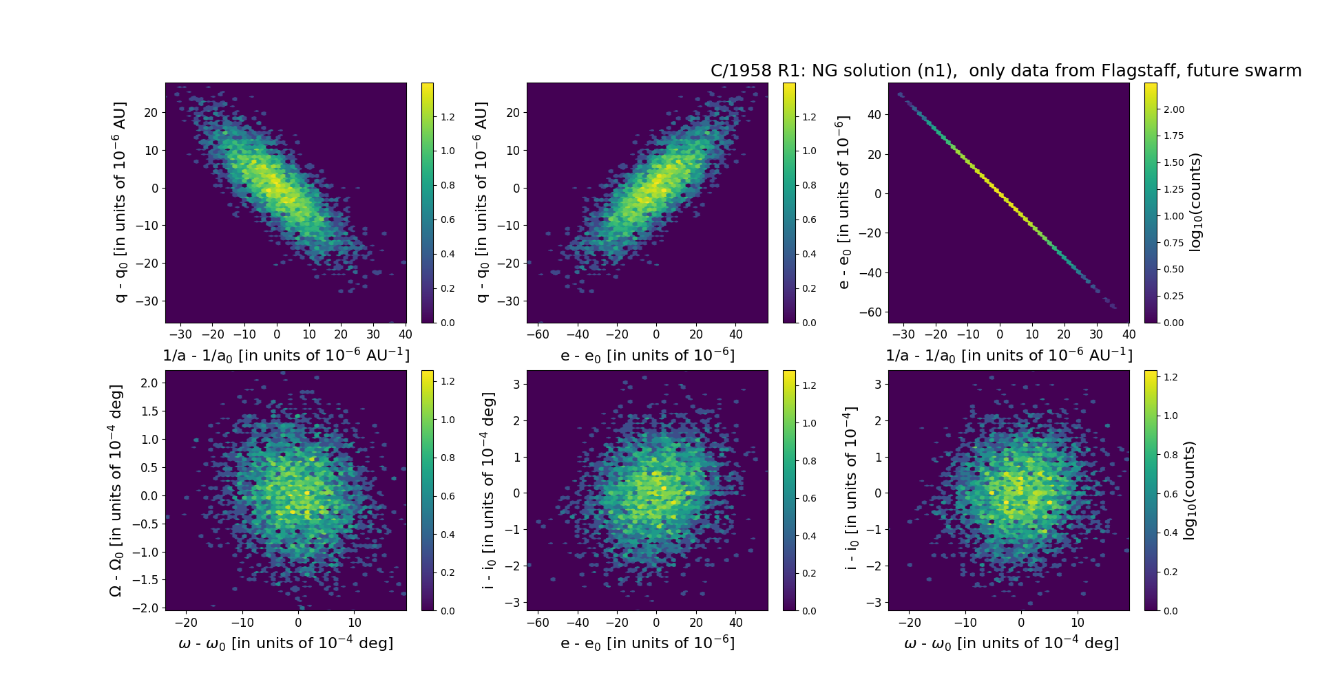 Comet had its closest approach to the Earth on 19 September 1958 (1.92 au, at this moment comet was 2.74 au from the Sun) and 18 March 1959 (1.94 au, six days after its perihelion passage).The MPC cometary database presents GR orbit based of 85 positional observations (data arc: 1958 09 07 – 1960 04 21), however only 40 observations obtained in Flagstaff are available in the MPC (data arc: 1958 09 14 – 1960 04 21), and the JPL offers GR osculating orbit based on this data set. We additionally collected observations from Yerkes, McDonald and Skalnaté Pleso observatories published in literature, and orbits 'ba' (GR) and 'bn' (NG) are based on 95 positional measurements (data arc: 1958 09 12 – 1960 04 21). For comparison purposes, we also presented orbits (GR and NG) using only Flagstaff data set (this set gives notable better rms for both types of orbits).
