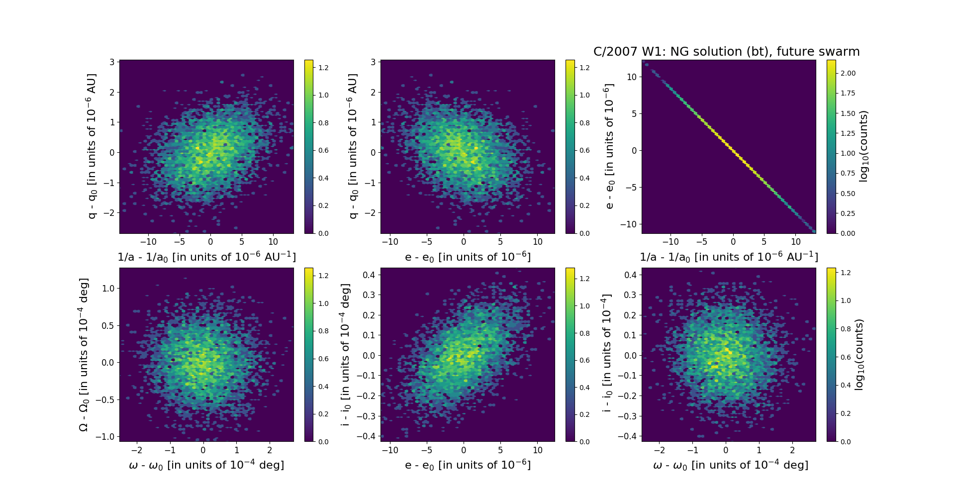For this comet, a considerable decrease in RMS for the symmetric non-gravitational solution compared with purely gravitational solution was observed, as well as a clear improvement in the amplitude of tendencies in right ascension and declination (compare nn with a5 solutions). A further substantial decrease in RMS occurs when an asymmetrical NG model is used to determine the orbit (n6).This last solution was recomended here as preferred global orbital solution; this solution is based on data spanning over 1.07 yr in a range of heliocentric distances: 3.33 au – 0.850 au (perihelion) – 2.84 au. However, for backward and forward dynamical evolution two separate orbital solutions are given: NG orbit for pre-perihelion arc of data dedicated for past orbital evolution, whereas NG orbit based on post-perihelion data is dedicated to future evolution.The NG parameters for both these NG solutions reveal that on average, the magnitude of NG acceleration obtained using positional data seems to be considerably greater after perihelion than before perihelion. A similar approach was applied earlier by Nakano for C/2007 W1; see Nakano Notes 1731Band Nakano Notes 1731A.
