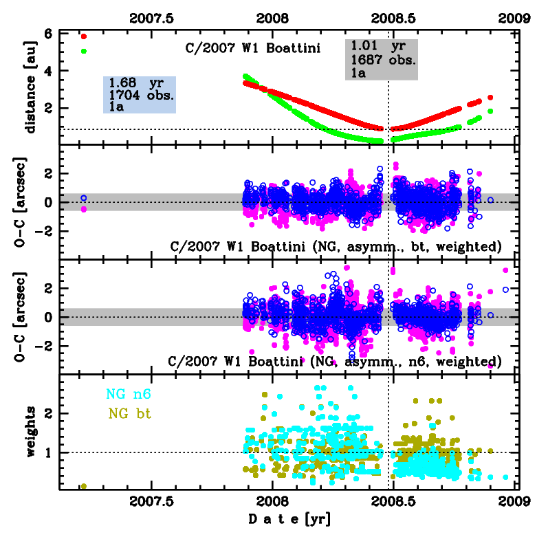 For this comet, a considerable decrease in RMS for the symmetric non-gravitational solution compared with purely gravitational solution was observed, as well as a clear improvement in the amplitude of tendencies in right ascension and declination (compare nn with a5 solutions). A further substantial decrease in RMS occurs when an asymmetrical NG model is used to determine the orbit (n6).This last solution was recomended here as preferred global orbital solution; this solution is based on data spanning over 1.07 yr in a range of heliocentric distances: 3.33 au – 0.850 au (perihelion) – 2.84 au. However, for backward and forward dynamical evolution two separate orbital solutions are given: NG orbit for pre-perihelion arc of data dedicated for past orbital evolution, whereas NG orbit based on post-perihelion data is dedicated to future evolution.The NG parameters for both these NG solutions reveal that on average, the magnitude of NG acceleration obtained using positional data seems to be considerably greater after perihelion than before perihelion. A similar approach was applied earlier by Nakano for C/2007 W1; see Nakano Notes 1731Band Nakano Notes 1731A.