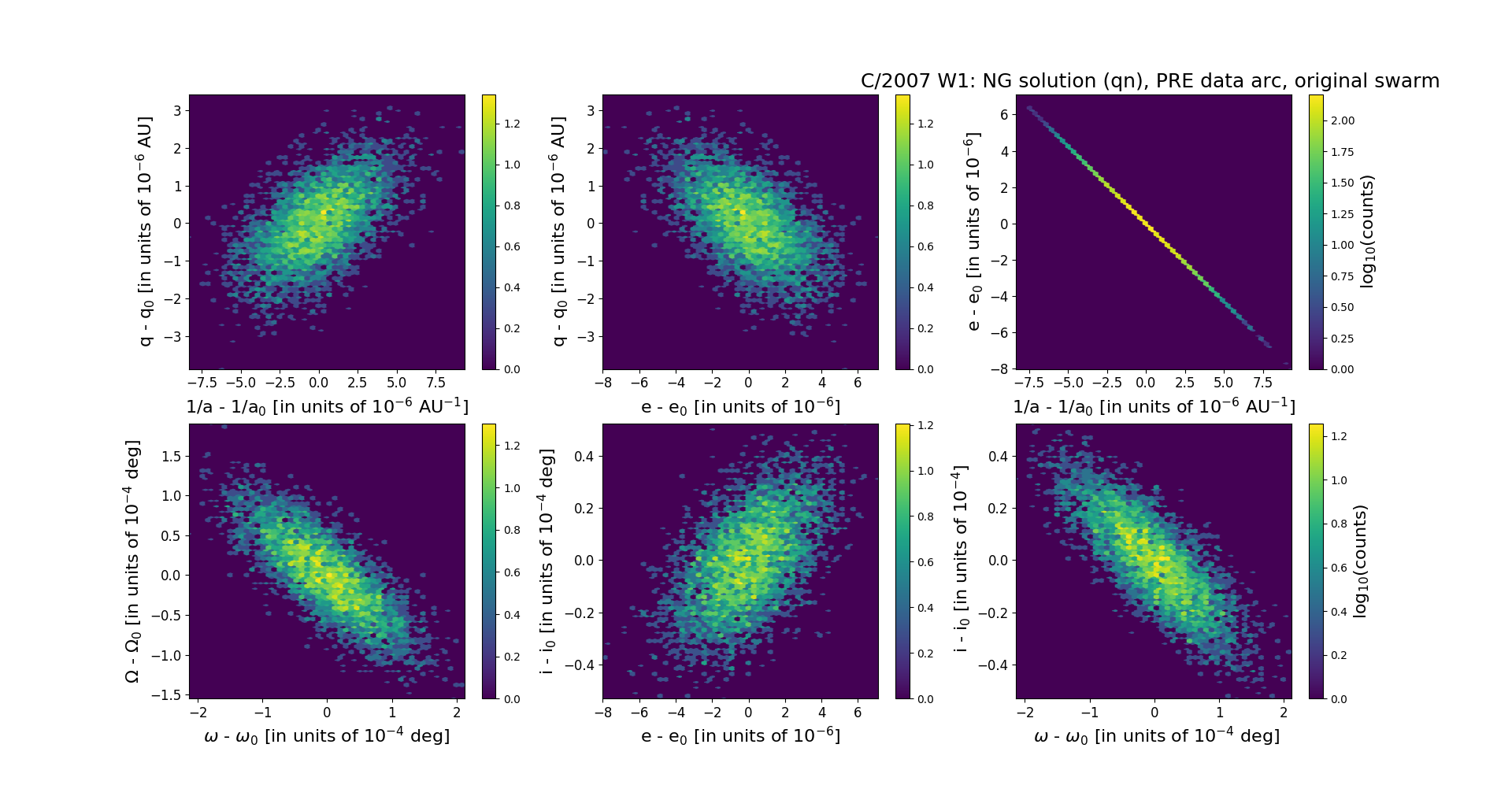 For this comet, a considerable decrease in RMS for the symmetric non-gravitational solution compared with purely gravitational solution was observed, as well as a clear improvement in the amplitude of tendencies in right ascension and declination (compare nn with a5 solutions). A further substantial decrease in RMS occurs when an asymmetrical NG model is used to determine the orbit (n6).This last solution was recomended here as preferred global orbital solution; this solution is based on data spanning over 1.07 yr in a range of heliocentric distances: 3.33 au – 0.850 au (perihelion) – 2.84 au. However, for backward and forward dynamical evolution two separate orbital solutions are given: NG orbit for pre-perihelion arc of data dedicated for past orbital evolution, whereas NG orbit based on post-perihelion data is dedicated to future evolution.The NG parameters for both these NG solutions reveal that on average, the magnitude of NG acceleration obtained using positional data seems to be considerably greater after perihelion than before perihelion. A similar approach was applied earlier by Nakano for C/2007 W1; see Nakano Notes 1731Band Nakano Notes 1731A.