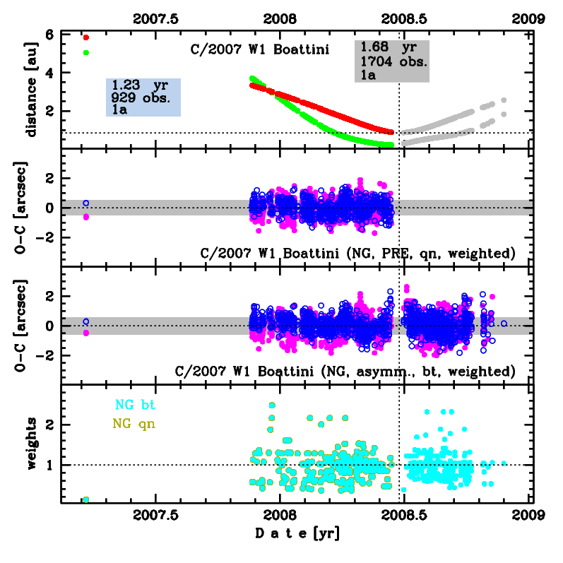 For this comet, a considerable decrease in RMS for the symmetric non-gravitational solution compared with purely gravitational solution was observed, as well as a clear improvement in the amplitude of tendencies in right ascension and declination (compare nn with a5 solutions). A further substantial decrease in RMS occurs when an asymmetrical NG model is used to determine the orbit (n6).This last solution was recomended here as preferred global orbital solution; this solution is based on data spanning over 1.07 yr in a range of heliocentric distances: 3.33 au – 0.850 au (perihelion) – 2.84 au. However, for backward and forward dynamical evolution two separate orbital solutions are given: NG orbit for pre-perihelion arc of data dedicated for past orbital evolution, whereas NG orbit based on post-perihelion data is dedicated to future evolution.The NG parameters for both these NG solutions reveal that on average, the magnitude of NG acceleration obtained using positional data seems to be considerably greater after perihelion than before perihelion. A similar approach was applied earlier by Nakano for C/2007 W1; see Nakano Notes 1731Band Nakano Notes 1731A.
