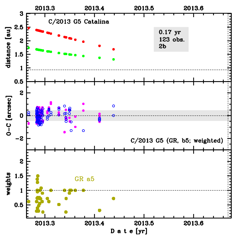 Comet C/2013 G5 was discovered on 13 April 2013 by R.A. Kowalski et al. (Catalina Sky Survey) and was followed only less than two months to June 9, that is only on pre-perihelion leg of its orbit (perihelion passage were predicted in September 1 in a heliocentric perihelion distance of 0.93 au). The closest approach to the Earth was expected on 14 September (0.402 au).