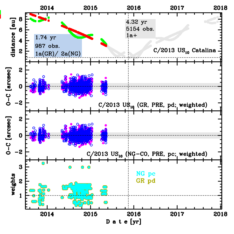 Comet C/2013 US10 was discovered on 31 October 2013 by R.A. Kowalski (Catalina Sky Survey), that is more than two years before perihelion passage. Later, series of pre-discovery measurements dating back to 2013 August 14 were found. This comet was intensively observed until 7 December 2017.C/2013 US10 had two close approaches to the Earth on 14 August 2015 (1.09 au, two months before perihelion) and on 17 January 2016 (0.725 au, two months after perihelion).