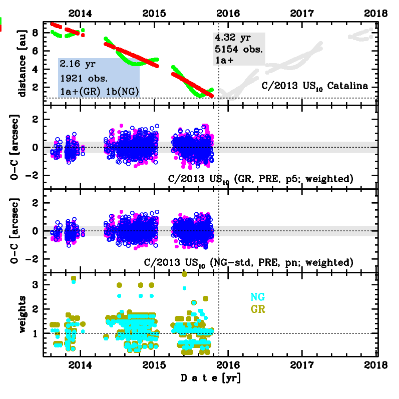 Comet C/2013 US10 was discovered on 31 October 2013 by R.A. Kowalski (Catalina Sky Survey), that is more than two years before perihelion passage. Later, series of pre-discovery measurements dating back to 2013 August 14 were found. This comet was intensively observed until 7 December 2017.C/2013 US10 had two close approaches to the Earth on 14 August 2015 (1.09 au, two months before perihelion) and on 17 January 2016 (0.725 au, two months after perihelion).