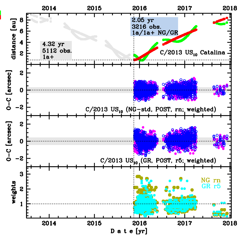 This is a comet with NG effects strongly manifested in positional data fitting. Solutions 'a5' and 'n5' (preferred) are based on data spanning over 4.3 yr in a range of heliocentric distances: 8.92 au – 0.823 au (perihelion) – 8.36 au.