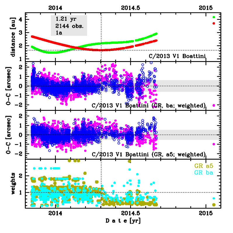 This is a comet with NG effects strongly manifested in positional data fitting. Solutions 'a5' and 'n5' (preferred) are based on data spanning over 1.2 yr in a range of heliocentric distances: 2.70 au – 1.661 au (perihelion) – 3.69 au. GR solution 'ba' differ from 'a5' in the method of data weighting, silimarly the pair of NG solutions 'bn' and 'n5'.