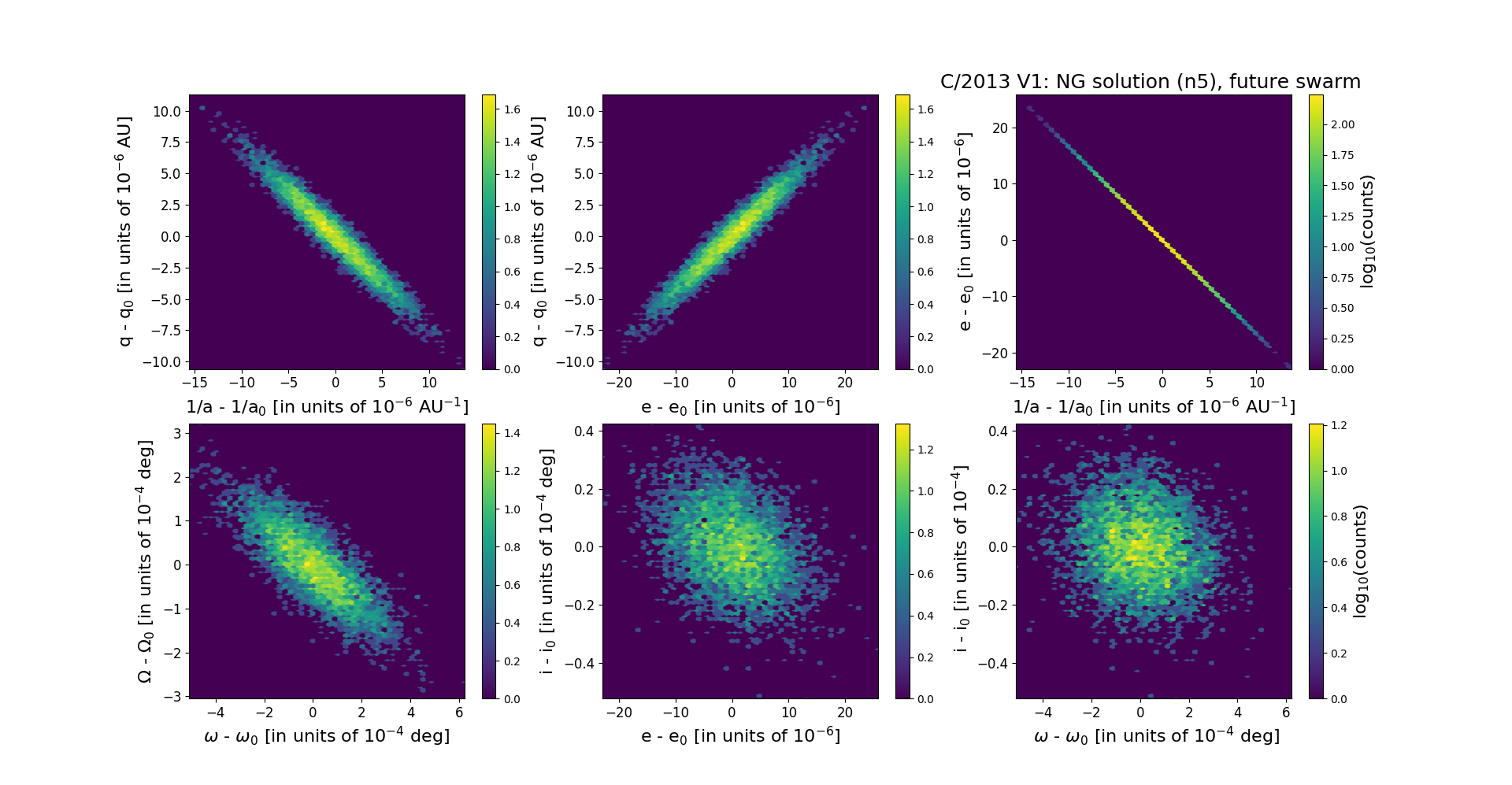This is a comet with NG effects strongly manifested in positional data fitting. Solutions 'a5' and 'n5' (preferred) are based on data spanning over 1.2 yr in a range of heliocentric distances: 2.70 au – 1.661 au (perihelion) – 3.69 au. GR solution 'ba' differ from 'a5' in the method of data weighting, silimarly the pair of NG solutions 'bn' and 'n5'.