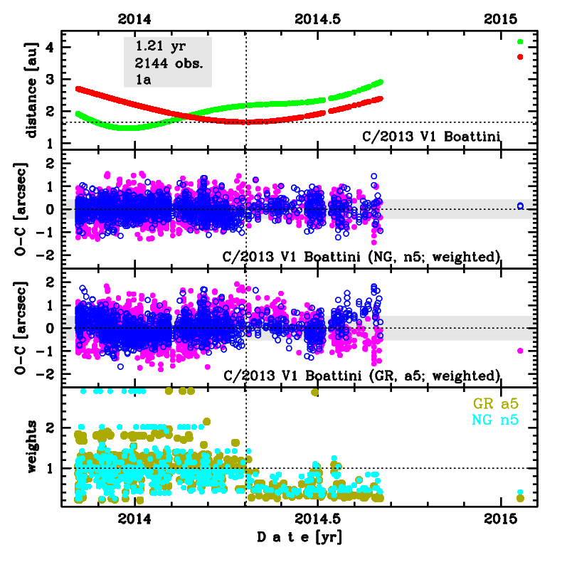 This is a comet with NG effects strongly manifested in positional data fitting. Solutions 'a5' and 'n5' (preferred) are based on data spanning over 1.2 yr in a range of heliocentric distances: 2.70 au – 1.661 au (perihelion) – 3.69 au. GR solution 'ba' differ from 'a5' in the method of data weighting, silimarly the pair of NG solutions 'bn' and 'n5'.