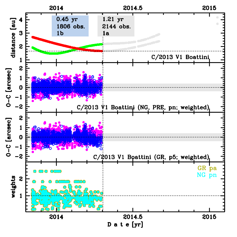 This is a comet with NG effects strongly manifested in positional data fitting. Solutions 'a5' and 'n5' (preferred) are based on data spanning over 1.2 yr in a range of heliocentric distances: 2.70 au – 1.661 au (perihelion) – 3.69 au. GR solution 'ba' differ from 'a5' in the method of data weighting, silimarly the pair of NG solutions 'bn' and 'n5'.