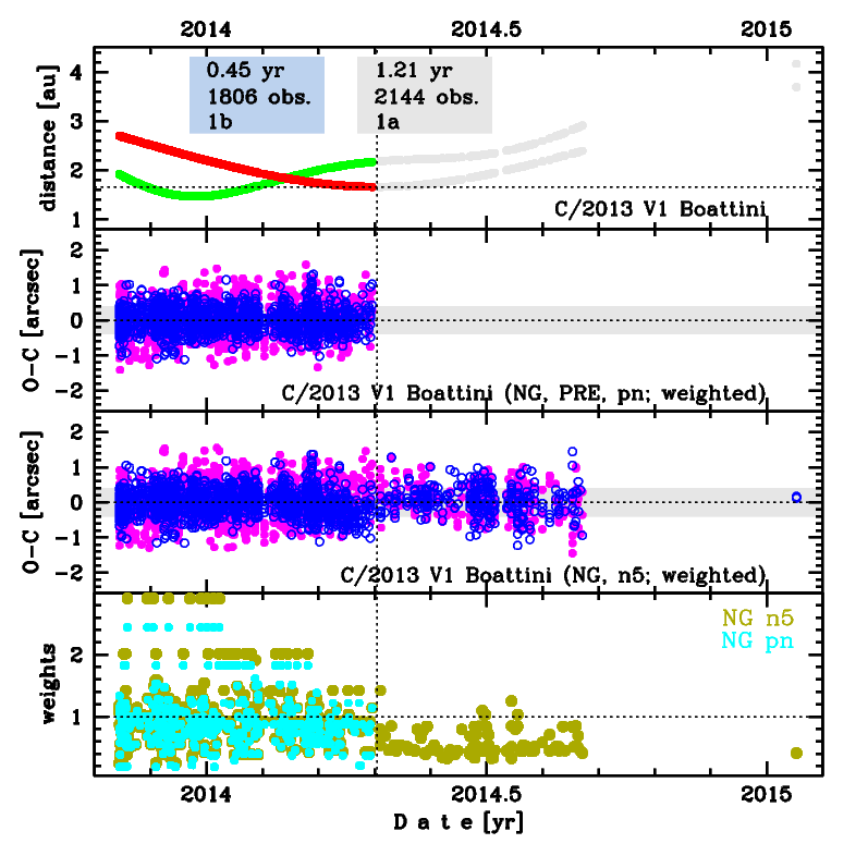 This is a comet with NG effects strongly manifested in positional data fitting. Solutions 'a5' and 'n5' (preferred) are based on data spanning over 1.2 yr in a range of heliocentric distances: 2.70 au – 1.661 au (perihelion) – 3.69 au. GR solution 'ba' differ from 'a5' in the method of data weighting, silimarly the pair of NG solutions 'bn' and 'n5'.