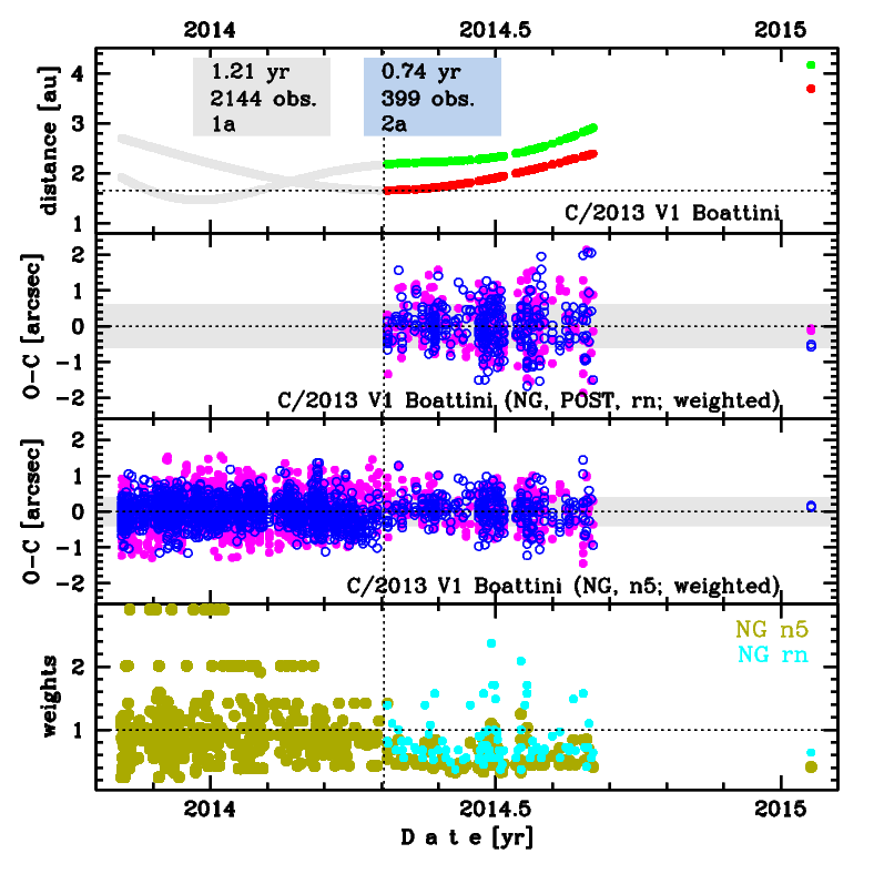 This is a comet with NG effects strongly manifested in positional data fitting. Solutions 'a5' and 'n5' (preferred) are based on data spanning over 1.2 yr in a range of heliocentric distances: 2.70 au – 1.661 au (perihelion) – 3.69 au. GR solution 'ba' differ from 'a5' in the method of data weighting, silimarly the pair of NG solutions 'bn' and 'n5'.