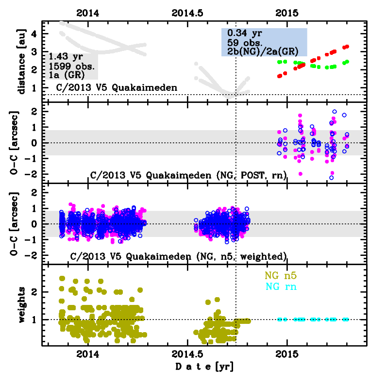 Upper panel: Time distribution of positional observations with corresponding heliocentric (red curve) and geocentric (green curve) distance at which they were taken. The horizontal dotted line shows the perihelion distance for a given comet whereas vertical dotted line — the moment of perihelion passage.