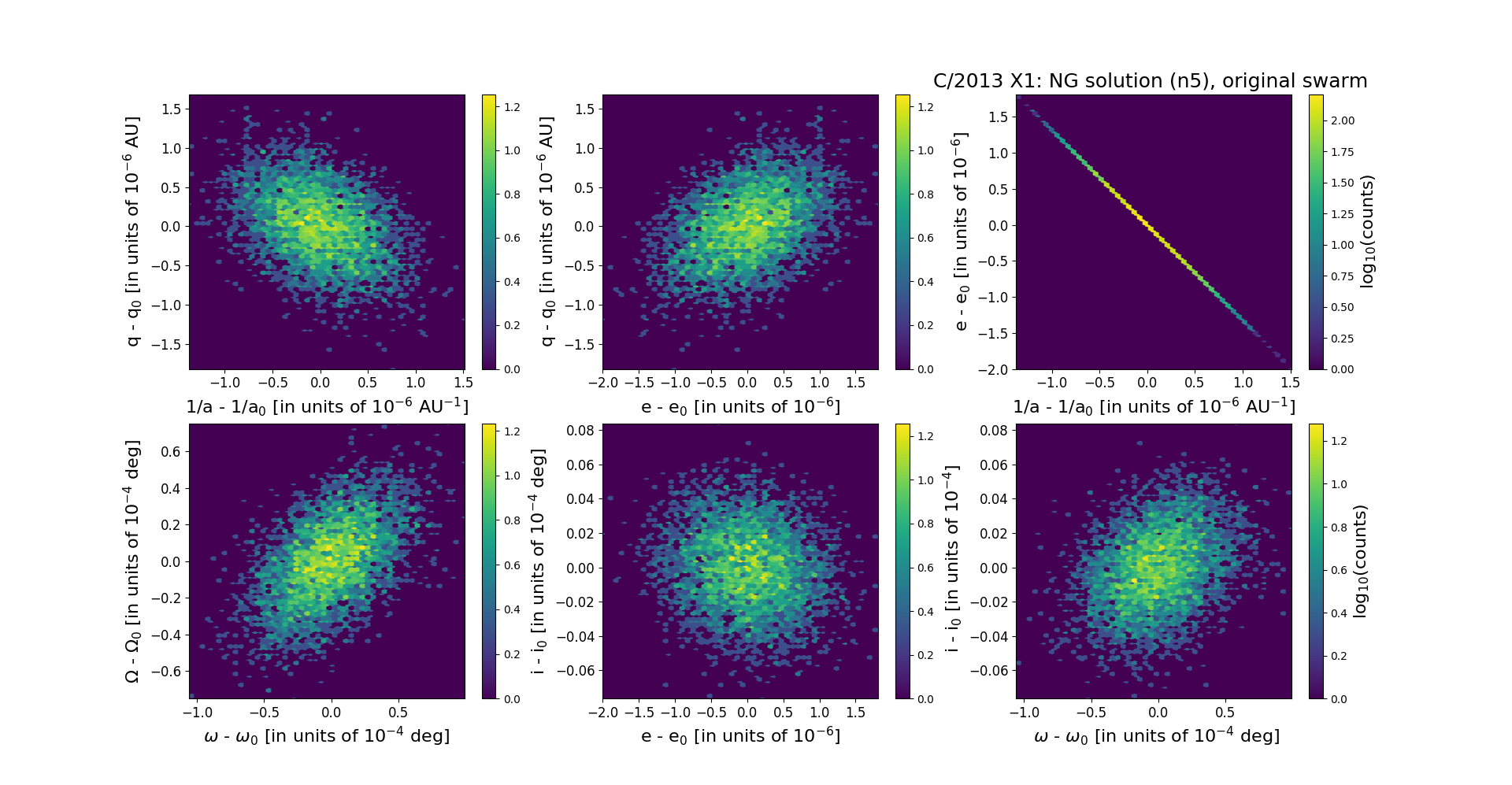 This is the comet with NG effects strongly manifested in positional data fitting. Solutions 'a5' (GR), 'n5' (NG), and t4 (asymm. NG, preferred orbit) are based on data spanning over 4.3 yr in a range of heliocentric distances: 9.25 au – 1.314 au (perihelion) – 7.17 au. Also NG orbit based on distant part of pre-perihelion leg of orbit was possible to obtain (see solution 'pd').