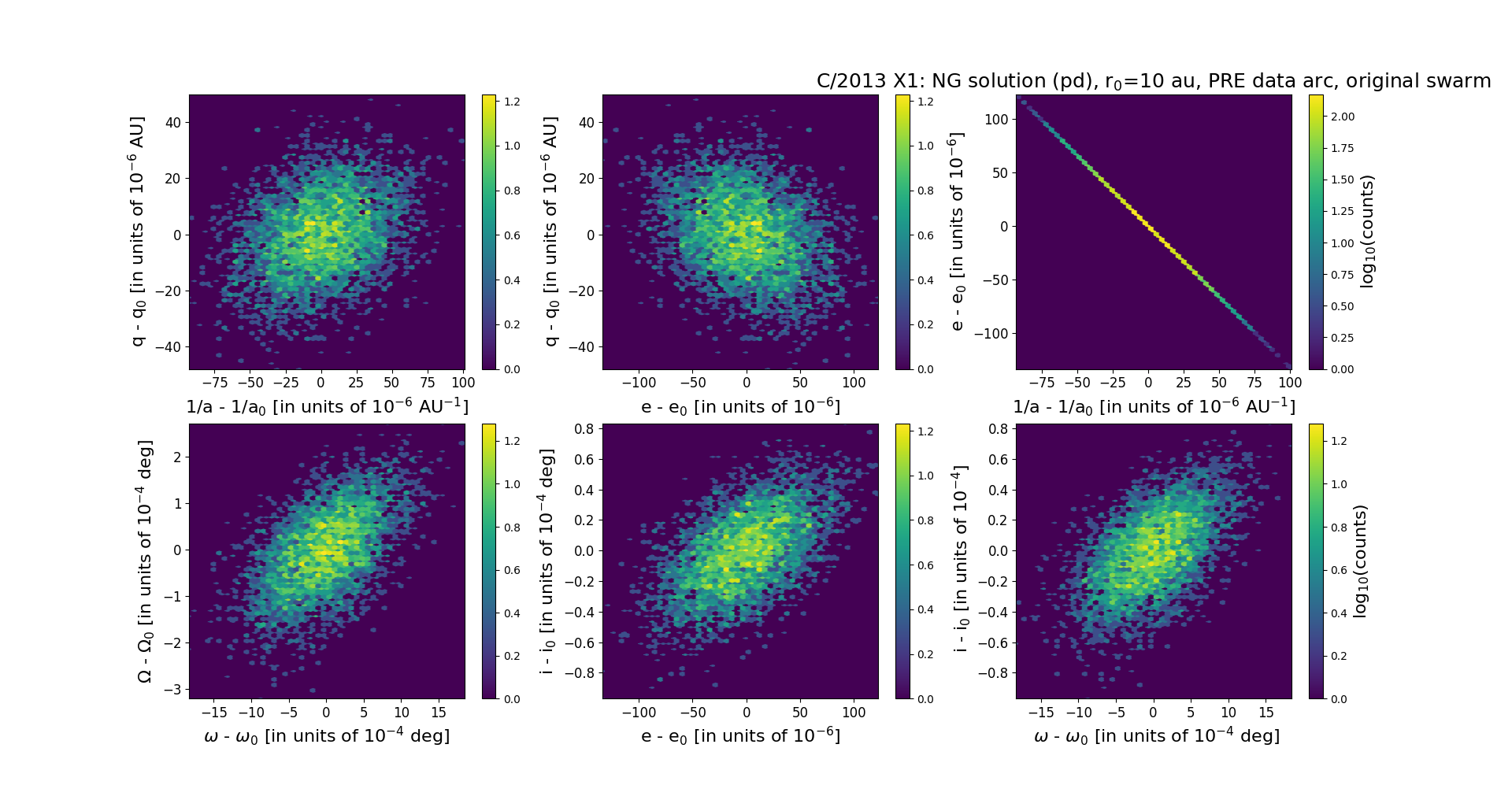 This is the comet with NG effects strongly manifested in positional data fitting. Solutions 'a5' (GR), 'n5' (NG), and t4 (asymm. NG, preferred orbit) are based on data spanning over 4.3 yr in a range of heliocentric distances: 9.25 au – 1.314 au (perihelion) – 7.17 au. Also NG orbit based on distant part of pre-perihelion leg of orbit was possible to obtain (see solution 'pd').