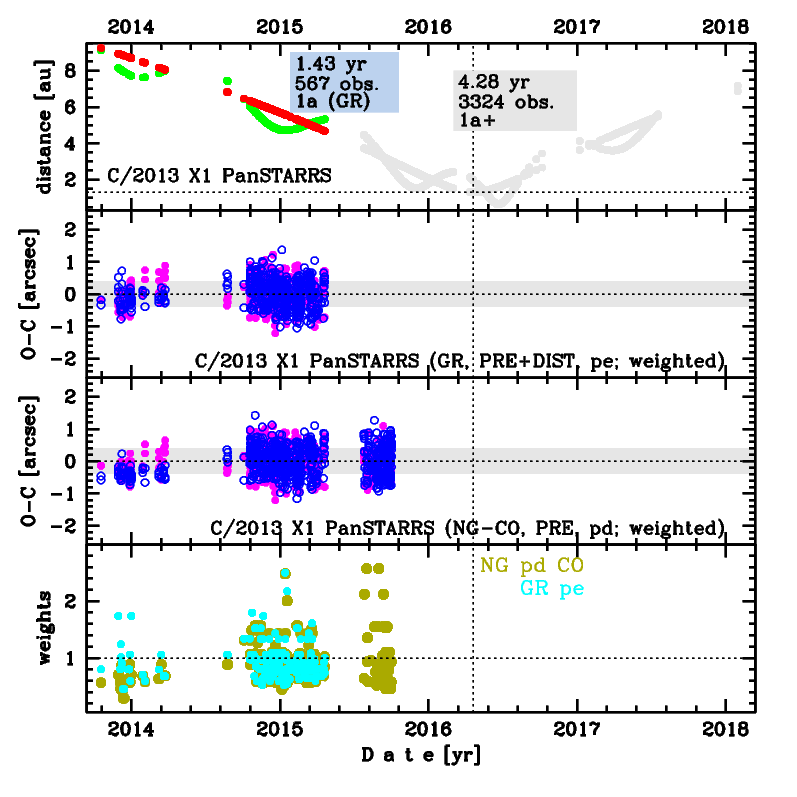 This is the comet with NG effects strongly manifested in positional data fitting. Solutions 'a5' (GR), 'n5' (NG), and t4 (asymm. NG, preferred orbit) are based on data spanning over 4.3 yr in a range of heliocentric distances: 9.25 au – 1.314 au (perihelion) – 7.17 au. Also NG orbit based on distant part of pre-perihelion leg of orbit was possible to obtain (see solution 'pd').