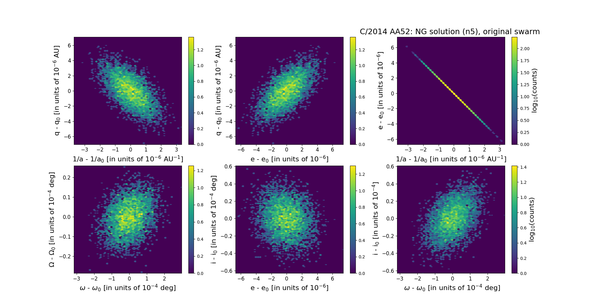 This is a comet with NG effects manifested in positional data fitting. Solutions 'a5' (GR) and 'n5' (NG, preferred) are based on data spanning over 1.7 yr in a range of heliocentric distances: 4.93 au – 2.00 au (perihelion) – 3.11 au.