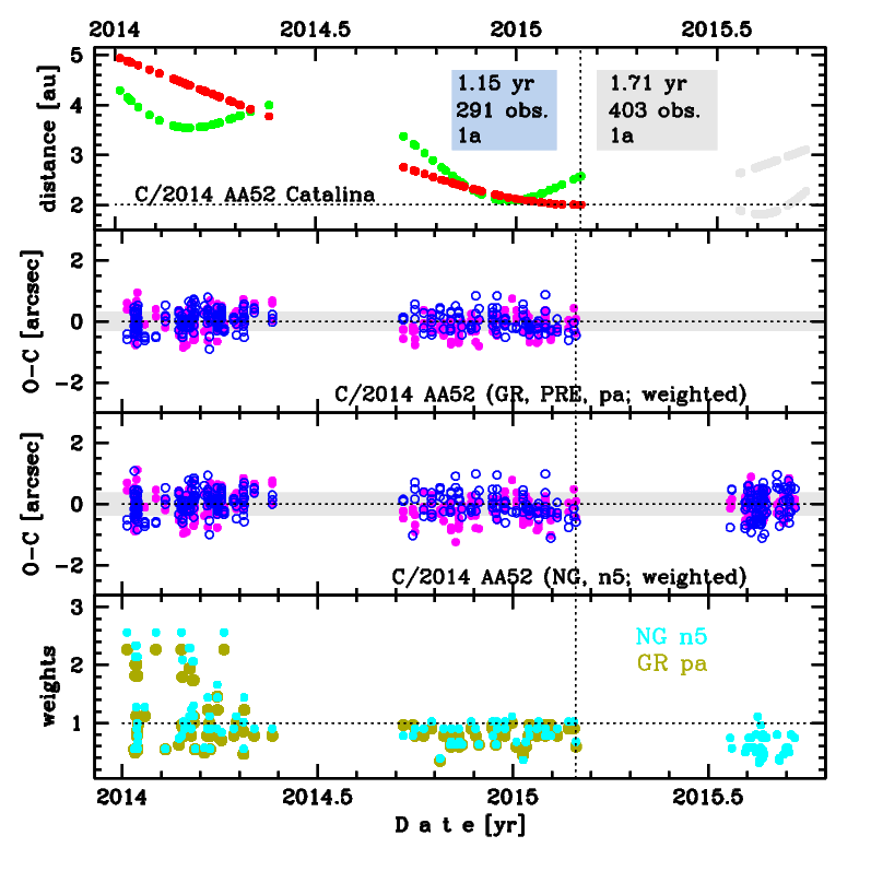 This is a comet with NG effects manifested in positional data fitting. Solutions 'a5' (GR) and 'n5' (NG, preferred) are based on data spanning over 1.7 yr in a range of heliocentric distances: 4.93 au – 2.00 au (perihelion) – 3.11 au.