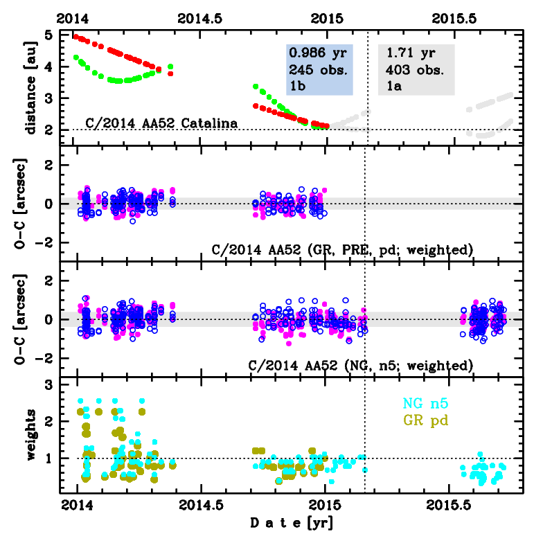 This is a comet with NG effects manifested in positional data fitting. Solutions 'a5' (GR) and 'n5' (NG, preferred) are based on data spanning over 1.7 yr in a range of heliocentric distances: 4.93 au – 2.00 au (perihelion) – 3.11 au.