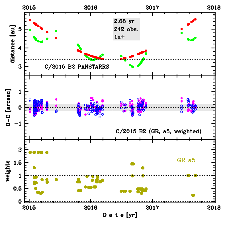 Upper panel: Time distribution of positional observations with corresponding heliocentric (red curve) and geocentric (green curve) distance at which they were taken. The horizontal dotted line shows the perihelion distance for a given comet whereas vertical dotted line — the moment of perihelion passage.