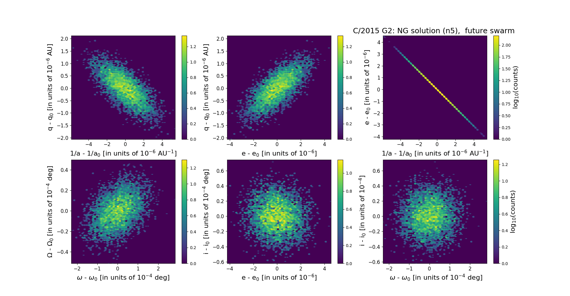 This is a comet with NG effects strongly manifested in positional data fitting. Solutions 'a5' and 'n5' (preferred) are based on data spanning over 0.86 yr in a range of heliocentric distances: 1.28 au – 0.780 au (perihelion) – 3.85 au. Though many trends visible in [O-C] for the GR solution are eliminated thanks to the NG solution, large residuals in alpha in the data from the beginning of the arc performed by MASTER (arc data: March 30 – April 8) are still worrying, which resulted in ejecting these positions in alpha (and leaving them in delta; see the [O-C] picture for solutions 'a5' and 'n5').