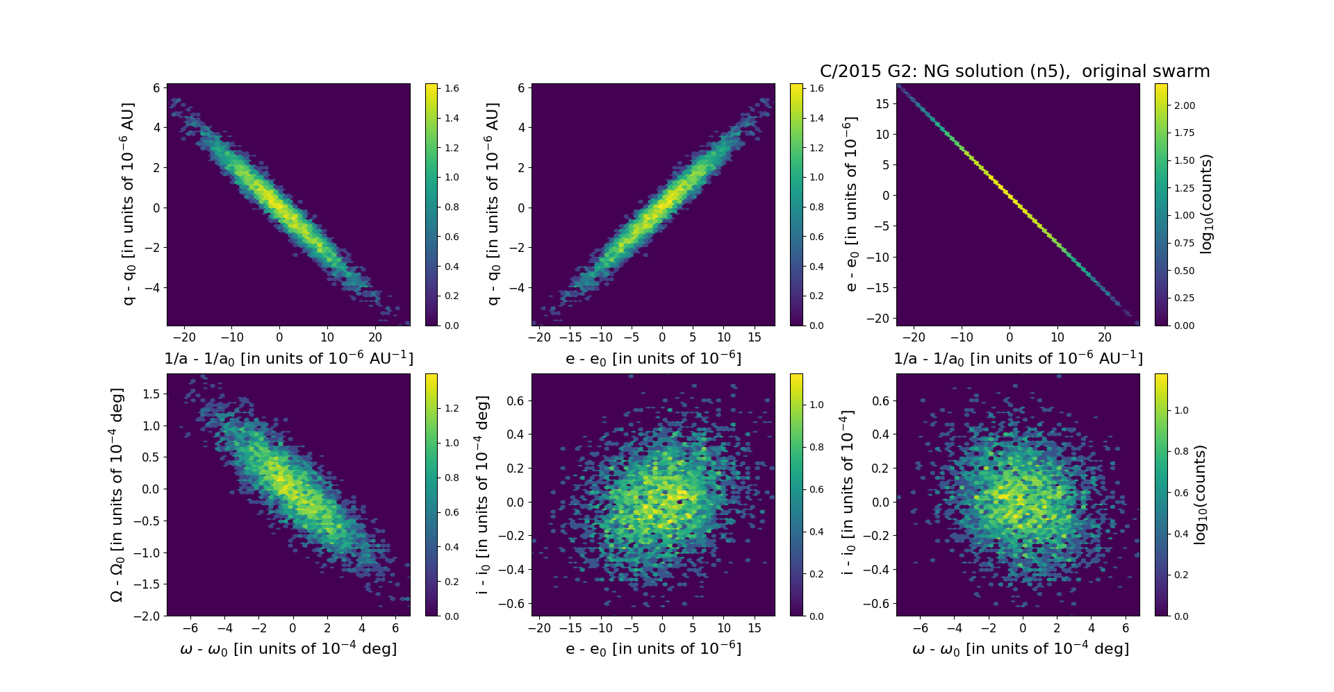 This is a comet with NG effects strongly manifested in positional data fitting. Solutions 'a5' and 'n5' (preferred) are based on data spanning over 0.86 yr in a range of heliocentric distances: 1.28 au – 0.780 au (perihelion) – 3.85 au. Though many trends visible in [O-C] for the GR solution are eliminated thanks to the NG solution, large residuals in alpha in the data from the beginning of the arc performed by MASTER (arc data: March 30 – April 8) are still worrying, which resulted in ejecting these positions in alpha (and leaving them in delta; see the [O-C] picture for solutions 'a5' and 'n5').