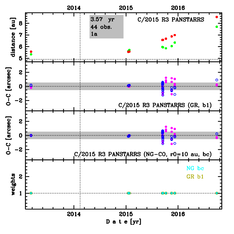 We recommended GR solution spanning over 3.57 yr in a range of heliocentric distances from 5.57 au – 4.90 au (perihelion) – 8.54 au as the preferred orbit( solution 'b1'), because radial component of NG~acceleration is negative in solution 'bc'.