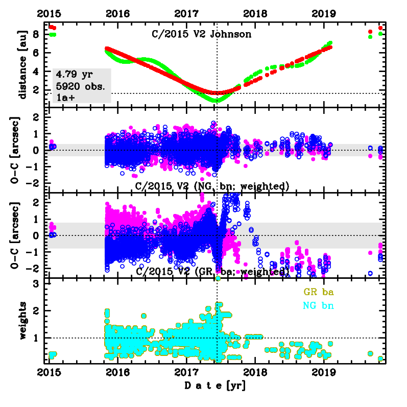 Comet C/2015 V2 was discovered on 3 November 2015 by Jess A. Johnson (Catalina Sky Survey), that is about a year and seven months before its perihelion passage. Next, 14 pre-discovery data were found going back to beginning of 2015 (January 11). Comet was observed extensively until 27 October 2019. C/2015 V2 had closest approach to the Earth on 4 June 2017 (0.811 au, about a week before the perihelion passage).