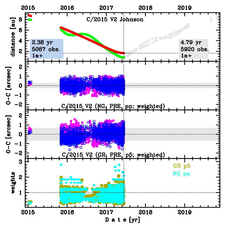 Comet C/2015 V2 was discovered on 3 November 2015 by Jess A. Johnson (Catalina Sky Survey), that is about a year and seven months before its perihelion passage. Next, 14 pre-discovery data were found going back to beginning of 2015 (January 11). Comet was observed extensively until 27 October 2019. C/2015 V2 had closest approach to the Earth on 4 June 2017 (0.811 au, about a week before the perihelion passage).