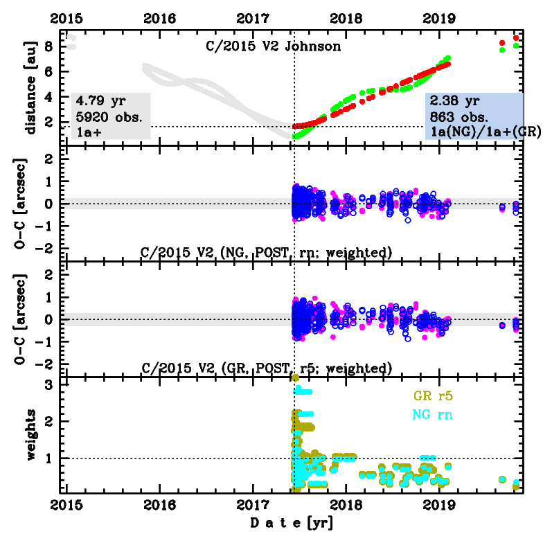 Comet C/2015 V2 was discovered on 3 November 2015 by Jess A. Johnson (Catalina Sky Survey), that is about a year and seven months before its perihelion passage. Next, 14 pre-discovery data were found going back to beginning of 2015 (January 11). Comet was observed extensively until 27 October 2019. C/2015 V2 had closest approach to the Earth on 4 June 2017 (0.811 au, about a week before the perihelion passage).