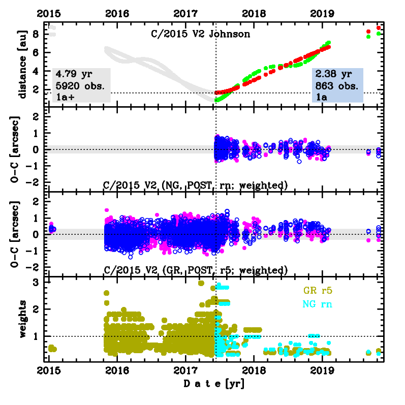 Comet C/2015 V2 was discovered on 3 November 2015 by Jess A. Johnson (Catalina Sky Survey), that is about a year and seven months before its perihelion passage. Next, 14 pre-discovery data were found going back to beginning of 2015 (January 11). Comet was observed extensively until 27 October 2019. C/2015 V2 had closest approach to the Earth on 4 June 2017 (0.811 au, about a week before the perihelion passage).