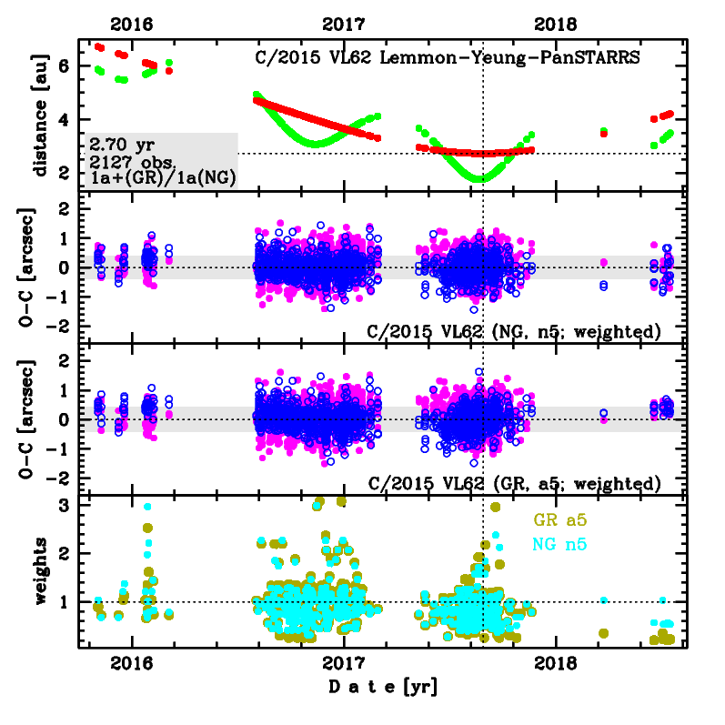 This is a comet with NG effects determinable using positional data fitting. Solutions 'a5' and 'n5' (preferred) are based on data spanning over 2.70 yr in a range of heliocentric distances: 6.72 au – 2.720 au (perihelion) – 4.21 au. GR solution 'ba' differ from 'a5' in the method of data weighting, silimarly the pair of NG solutions 'bn' and 'n5', and 'pn' and 'pe' ((the last pair of NG solutions is based on pre-perihelion data arc). NG parameters are better determined for solutions 'bn' than the 'n5'. However, in both solutions are still visible tiny trends in [O-C]. In our opinion, the better is [O-C] for the solution 'n5', especially in the first and last opposition. Thus, we suggest this solution be treated as preferred. Alternatively, the solution 'pe' (based on the pre-perihelion orbital leg) can also be taken for the study of the origin of this comet.