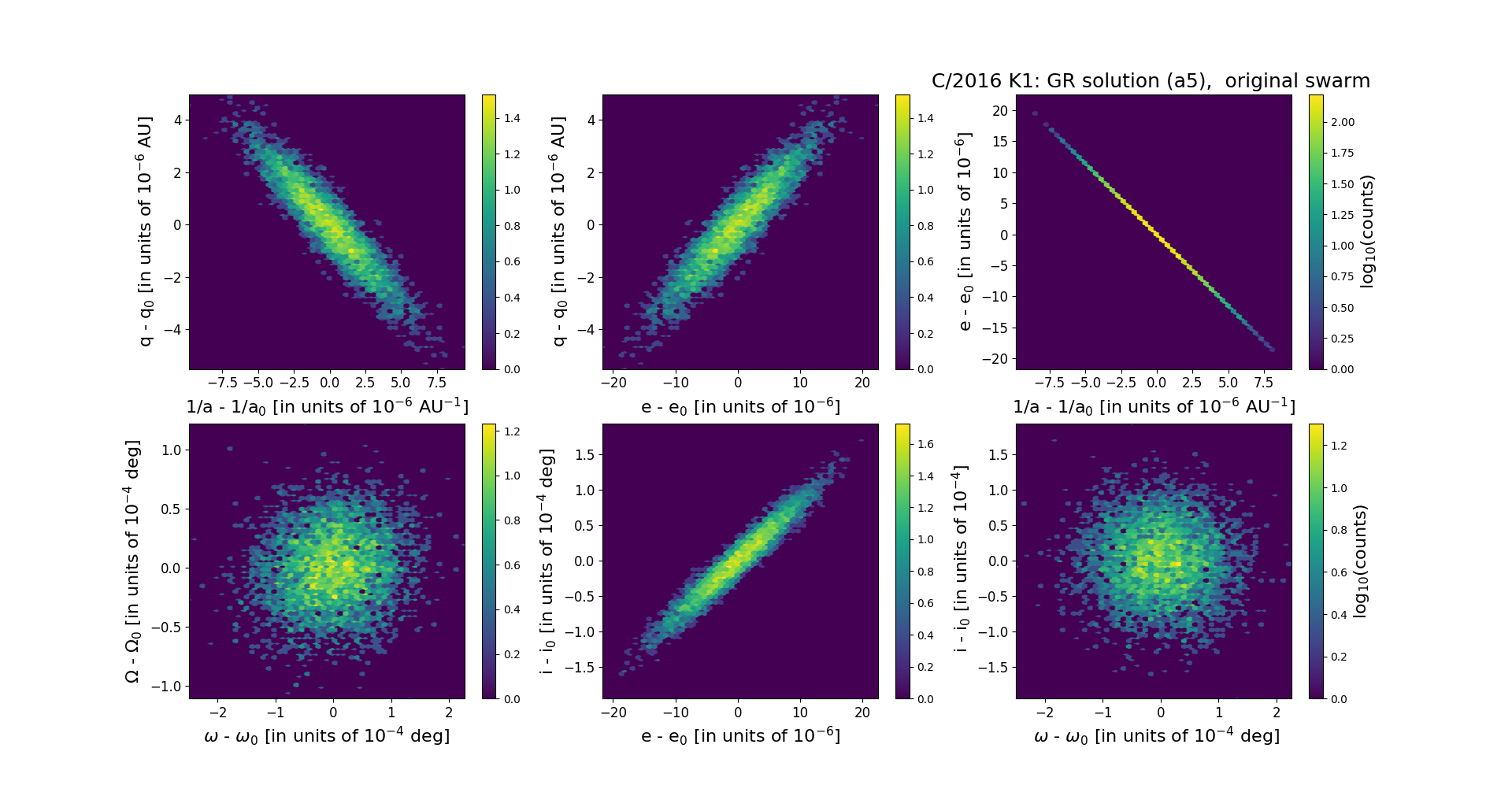 This is a comet with NG effects determinable using positional data fitting. All solutions (GR and NG) are based on data spanning over 0.836 yr in a range of heliocentric distances: 2.34 au – 2.292 au (perihelion) – 3.64 au.