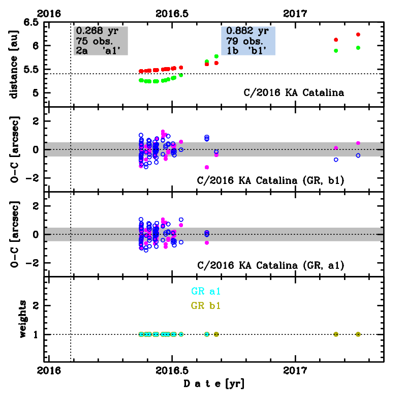 Comet C/2016 KA was discovered on 16 May 2016 with Catalina Sky Survey, that is about 3.5 months after its perihelion passage. This comet was observed about three months until 3 April 2017.