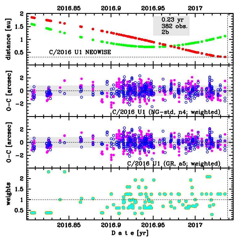 Despite short data arc this is a comet with NG effects determinable using positional data fitting. Both solutions (GR and NG) are based on data spanning over 0.227 yr in the pre-perihelion orbital leg, in a range of heliocentric distances from 1.86 au to 0.321 au.