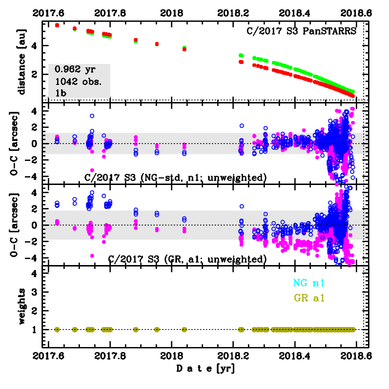 Therefore, we give here two pairs of orbits (GR nd NG). First using the entire available data arc (solutions 'a1' and 'n1'), that is based on data spanning over 0.962 yr in a range of heliocentric distances from 5.41 au to 0.48 au. Due to destruction process, the GR solution ('a1') gives spectacular picture of time distribution of residuals (see [O-C] picture associated with solution 'a1'). Analogous signature in [O-C] was previously obtained by Sekanina and Kracht 2018 .The NG solution ('n1') based on constant NG parameters only partially reduces these trends in [O-C]; however, the improvement is only visible until heliocentric distances larger than about 1.5 au (mid-June). Thus, the second pair of solutions ('a3' and 'n3') is based on a shorter pre-perihelion data arc spanning 0.82 yr to a heliocentric distance of 1.56 au. Then both orbits give satisfactory [O-C] (see the pictures for 'a3' and 'n3' solutions); however, the [O-C] seems slightly better for the 'n3' orbit. GR orbit 'a3' have about two times larger uncertainties of orbital elements than the solution based on data up to the end of June given by Sekanina and Kracht in Table 5 (2018). However, thanks to shorter data arc than in Sekanina and Kracht, we have similar predictions on reciprocals of original semimajor axis for GR and NG orbits.