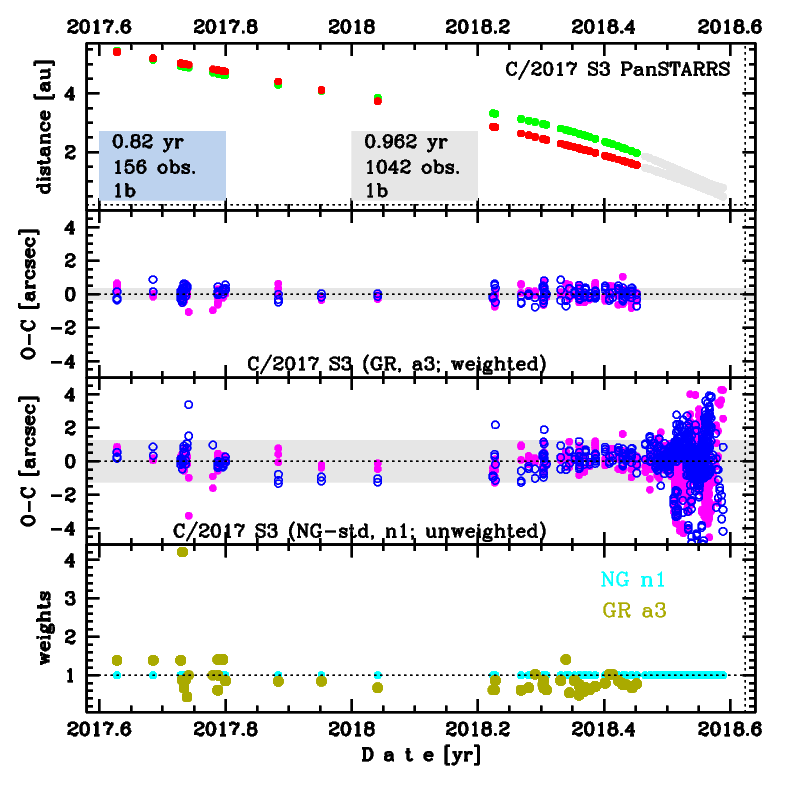 Therefore, we give here two pairs of orbits (GR nd NG). First using the entire available data arc (solutions 'a1' and 'n1'), that is based on data spanning over 0.962 yr in a range of heliocentric distances from 5.41 au to 0.48 au. Due to destruction process, the GR solution ('a1') gives spectacular picture of time distribution of residuals (see [O-C] picture associated with solution 'a1'). Analogous signature in [O-C] was previously obtained by Sekanina and Kracht 2018 .The NG solution ('n1') based on constant NG parameters only partially reduces these trends in [O-C]; however, the improvement is only visible until heliocentric distances larger than about 1.5 au (mid-June). Thus, the second pair of solutions ('a3' and 'n3') is based on a shorter pre-perihelion data arc spanning 0.82 yr to a heliocentric distance of 1.56 au. Then both orbits give satisfactory [O-C] (see the pictures for 'a3' and 'n3' solutions); however, the [O-C] seems slightly better for the 'n3' orbit. GR orbit 'a3' have about two times larger uncertainties of orbital elements than the solution based on data up to the end of June given by Sekanina and Kracht in Table 5 (2018). However, thanks to shorter data arc than in Sekanina and Kracht, we have similar predictions on reciprocals of original semimajor axis for GR and NG orbits.