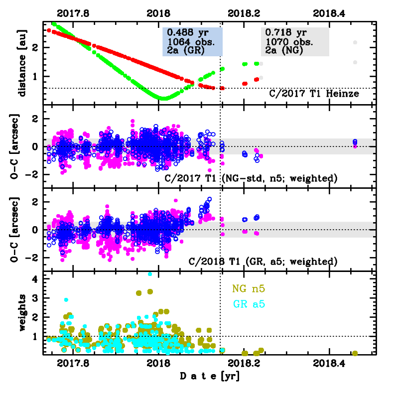 This is a comet with NG effects strongly manifested in positional data fitting and during GR orbit determination the series of three measurements from June 17 were ejected due to large residuals and systematically small weights were obtained for all remaining post-perihelion observations. Therefore, this GR orbit (solutions 'a5') is based on data spanning over 0.488 yr in a range of heliocentric distances: 2.60 au – 0.581 au (perihelion) – 0.90 au. During NG orbit determination weights in post-perihelion leg are also systematically small; however, series of last three measurements were not ejected. So, NG orbit ('n5') is based on data spanning over 0.718 yr in a range of heliocentric distances: 2.60 au – 0.581 au (perihelion) – 2.18 au. However, we suggest the solution 'pn' (based on the pre-perihelion orbital leg up to heliocentric distance of 0.782 au) to be treated as 'preferred' orbit for the study of the origin of this comet.
