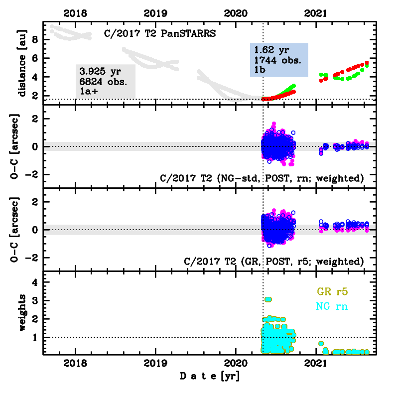 detectability of NG effects in the comet's motion | comet with NG effects strongly manifested in positional data fitting | |