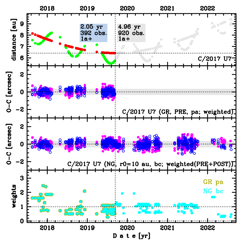 Comet C/2017 U7 was discovered on 29 October 2017 with the Pan-STARRS 1 telescope (Haleakala), that is almost 2 years before its perihelion passage. Several prediscovery images of this comet were found: taken by the same survey from 18 August and 13 September 2017. This comet was observed until 3 August 2022.