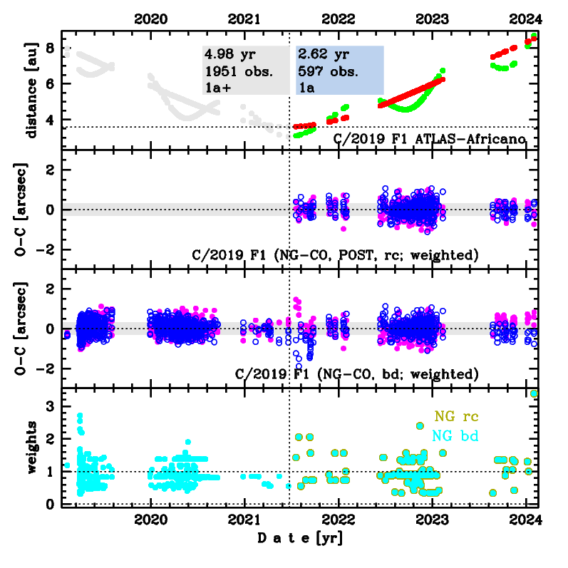 This comet reveals strong NG effects within positional data (see [O-C] for solution 'bb'). The preferred NG solution given here span over 4.98 yr in a range of heliocentric distances: 7.96 au – 3.60 au (perihelion) – 8.514 au; also orbits based on pre-perihelion data and post-perihelion data are presented.
