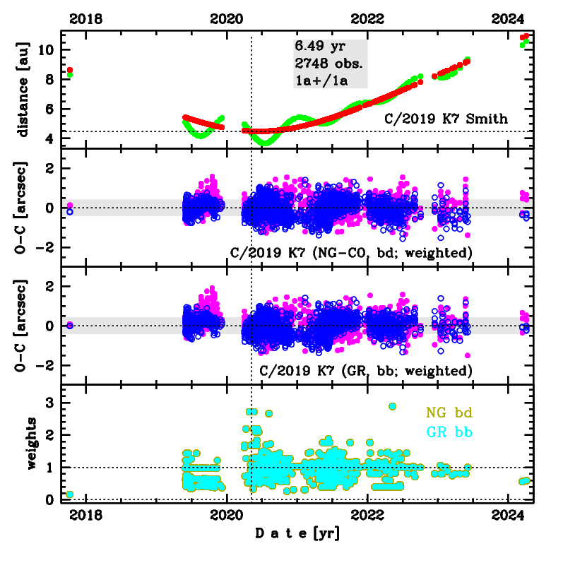 Comet C/2019 K7 was discovered on 30 May 2019, more than one year before its perihelion passage. Later a few pre-discovery observations were found from 8 and 9 October 2017. This comet was observed until 4 April 2024 (as in February 2025).