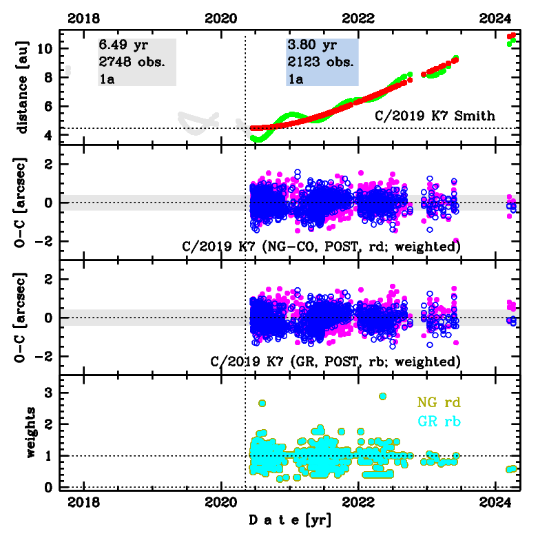 Comet C/2019 K7 was discovered on 30 May 2019, more than one year before its perihelion passage. Later a few pre-discovery observations were found from 8 and 9 October 2017. This comet was observed until 4 April 2024 (as in February 2025).