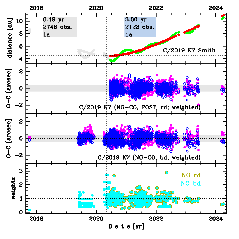 Comet C/2019 K7 was discovered on 30 May 2019, more than one year before its perihelion passage. Later a few pre-discovery observations were found from 8 and 9 October 2017. This comet was observed until 4 April 2024 (as in February 2025).