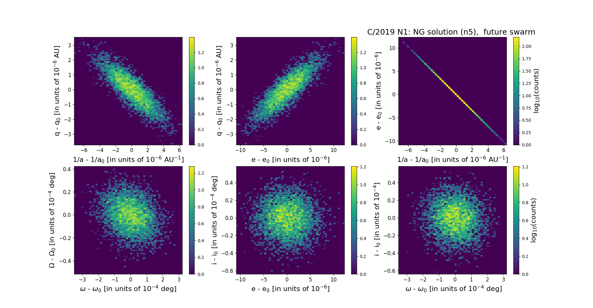 This Oort spike comet suffers large planetary perturbations while passing through the planetary system; these perturbations lead to a definitely more tight future orbit with semimajor axis of about 1000 au (see future barycentric orbits).