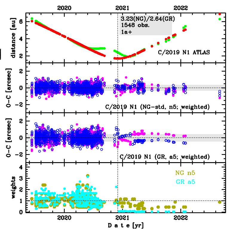 This is a comet with NG effects strongly manifested in positional data fitting. During GR orbit determination the series of measurements since 30 January 2022 wereejected due to large rersiduals and extremely low weights for all remaining post-perihelion observations were obtained (see [O-C] picture for 'a5' solution). Therefore, this GR orbit ('a5') is based on data spanning over 2.64 yr in a range of heliocentric distances: 6.05 au – 1.705 au (perihelion) – 5.05 au. During NG orbit determination weights in post-perihelion leg are also systematically small but notable larger than in the GR case and the full post-perihelion data arc were included. So, NG orbit ('n5') is based on data spanning over 3.23 yr in a range of heliocentric distances: 6.05 au – 1.705 au (perihelion) – 5.05 au. We suggest, this 'n5' orbit to be treated as 'preferred' for the dynamical study. Solution 'pa' represents GR orbit resulting from the entire pre-periheliuon data arc, and solutions 'pd' (GR) and'dd' (NG solution based on g(r)-formula for more volatile ices than water ice) are orbits obtained using the distant pre-perihelion data arc (heliocentric distance larger than 2.03 au).