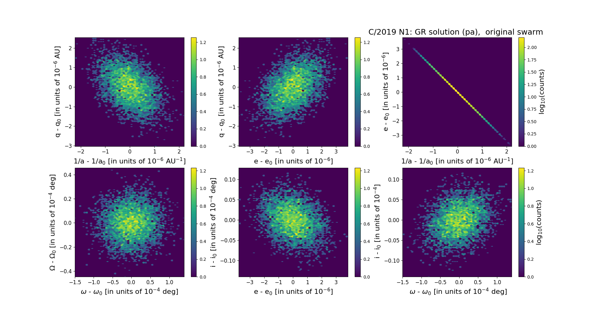 This is a comet with NG effects strongly manifested in positional data fitting. During GR orbit determination the series of measurements since 30 January 2022 wereejected due to large rersiduals and extremely low weights for all remaining post-perihelion observations were obtained (see [O-C] picture for 'a5' solution). Therefore, this GR orbit ('a5') is based on data spanning over 2.64 yr in a range of heliocentric distances: 6.05 au – 1.705 au (perihelion) – 5.05 au. During NG orbit determination weights in post-perihelion leg are also systematically small but notable larger than in the GR case and the full post-perihelion data arc were included. So, NG orbit ('n5') is based on data spanning over 3.23 yr in a range of heliocentric distances: 6.05 au – 1.705 au (perihelion) – 5.05 au. We suggest, this 'n5' orbit to be treated as 'preferred' for the dynamical study. Solution 'pa' represents GR orbit resulting from the entire pre-periheliuon data arc, and solutions 'pd' (GR) and'dd' (NG solution based on g(r)-formula for more volatile ices than water ice) are orbits obtained using the distant pre-perihelion data arc (heliocentric distance larger than 2.03 au).