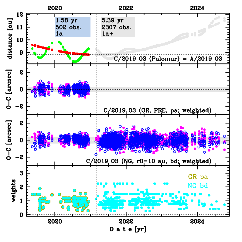 Currently, preferred NG solution given here are based on data span over 5.39 yr in a range of heliocentric distances: 9.61 au – 8.82 au (perihelion) – 11.51 au. Orbits based on pre-perihelion and post-perihelion data independently were also obtained.