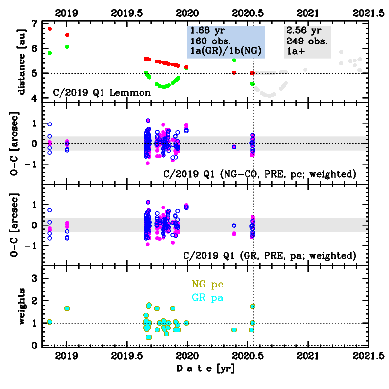 Solutions (GR and NG) given here are based on data span over 2.56 yr in a range of heliocentric distances: 6.80 au – 5.00 au (perihelion) – 5.56 au. Orbits based on pre-perihelion and post-perihelion data independently were also obtained.