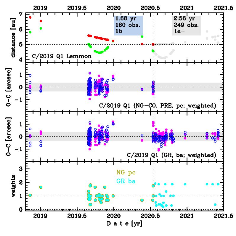 Solutions (GR and NG) given here are based on data span over 2.56 yr in a range of heliocentric distances: 6.80 au – 5.00 au (perihelion) – 5.56 au. Orbits based on pre-perihelion and post-perihelion data independently were also obtained.