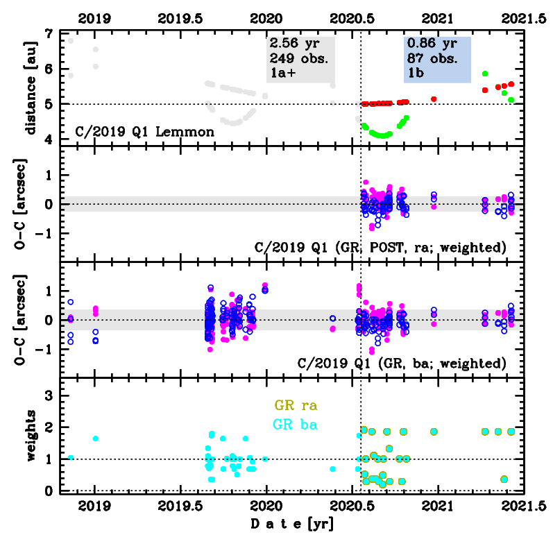 Solutions (GR and NG) given here are based on data span over 2.56 yr in a range of heliocentric distances: 6.80 au – 5.00 au (perihelion) – 5.56 au. Orbits based on pre-perihelion and post-perihelion data independently were also obtained.